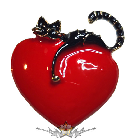 Black cat. Fekete macska piros szíven – titokzatosság és szerelem.   bross, kitűző.