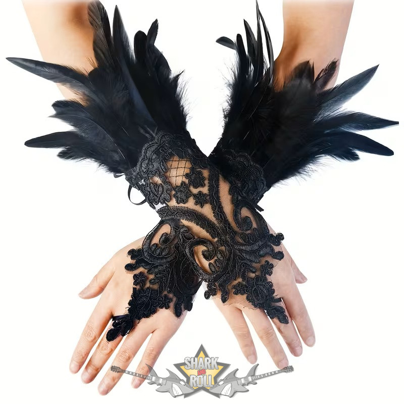 Gótikus csipke műtollas kesztyűk, csipke mandzsetta . 1 pár fekete csipke kesztyű.