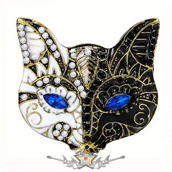 Vintage - macska maszk bross drágakövekkel - Bonyolult fekete-fehér dizájn, bross, kitűző.